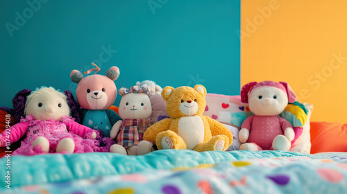 playful scene of dolls and stuffed animals on colorful bed, showcasing variety of plush toys in vibrant colors, creating cheerful atmosphere