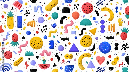 Playful seamless pattern with colorful geometric shapes and abstract elements on white modern background