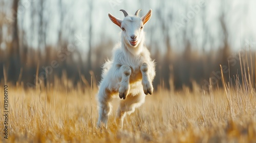 Playful white goat jumping in a golden field on a sunny day. Rural farm life and nature concept for agriculture and lifestyle designs.