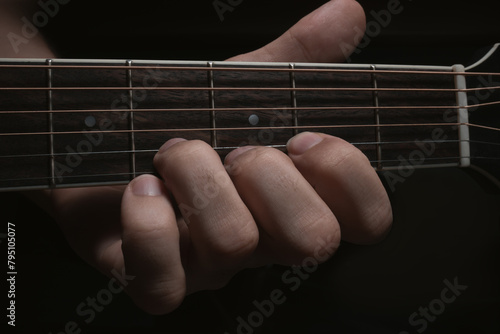 Playing an acoustic guitar. Close-up of the hand on the neck