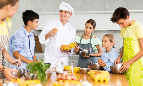 Pleasant and sociable young man, professional chef, leading culinary courses, imparting cooking skills to group of interested tweens..