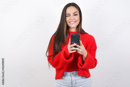 Pleased young beautiful brunette woman wearing red knitted sweater over white wall using self phone and looking and winking at the camera. Flirt and coquettish concept.