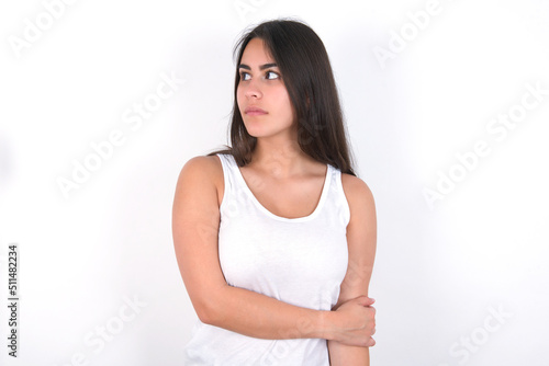Pleased young beautiful brunette woman wearing white top over white wall keeps hands crossed over chest looks happily aside