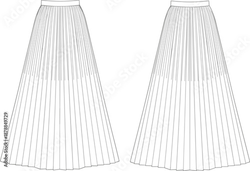 Pleated skirt fashion sketch, waistband garment design, apparel template, stylish clothing illustration, elegant fashion outline, flat vector illustration