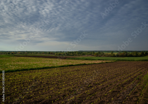 field, landscape, agriculture, sky, green, grass, nature, farm, rural, blue, plant, spring, land, meadow, wheat, summer, countryside, cloud, cloud, farming, horizon, crop, outdoors, harvest, plain