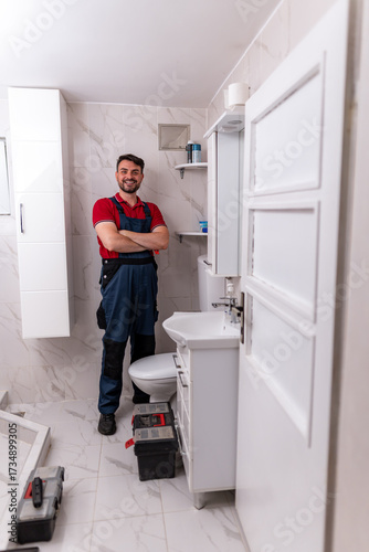 Plumber in a modern bathroom ready for work with tools at hand and a confident smile