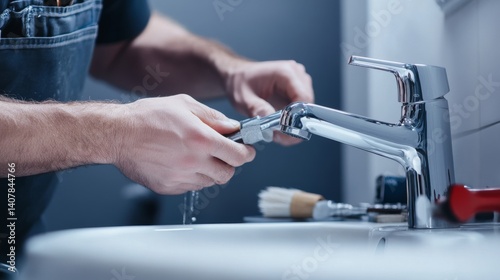Plumber installing a sink faucet in a bathroom. Featuring skill and attention to detail