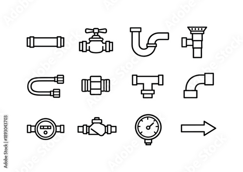 plumbing, icon, set, system, element, line, water, pipe, valva, trap, drain, supply, hose, connector