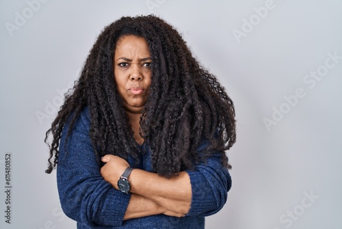 Plus size hispanic woman standing over white background skeptic and nervous, disapproving expression on face with crossed arms. negative person.