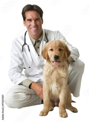 golden retriever, professional, vet, transparent, veterinary, full body, retriever, clothing, isolated, apparel, sitting, smiling, element, animal, doctor, gold, health, person, adult, floor, happy, human, photo, puppy, white, care, coat, cute, male, dog, man, pet