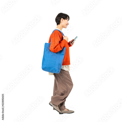 スマホを持って歩くおしゃれなミドル女性 手作業で精密に切り抜いた背景透過全身写真PNG