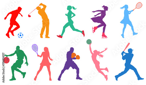 illustration, silhouette, transparent, activity, collection, athlete, colourful, isolated, movement, diverse, dynamic, element, figure, people, player, sport, mixed, woman, man, set, athletic