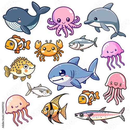 illustration, marine life, transparent, underwater, creature, jellyfish, adorable, colourful, ocean life, wildlife, animal, aquatic, cartoon, dolphin, octopus, playful, marin, ocean, shark, whale, crab, cute, fish, life, sea