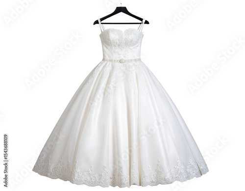 PNG of traditional wedding dress on hanger, isolated on transparent background.