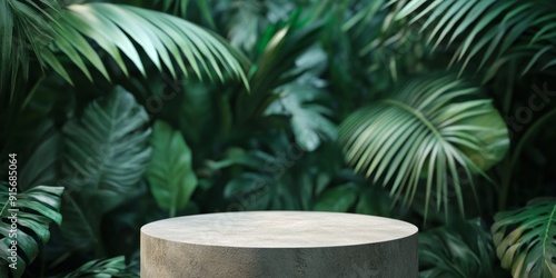 Podium made of natural minimalist round stone against a background of tropical palm leaves