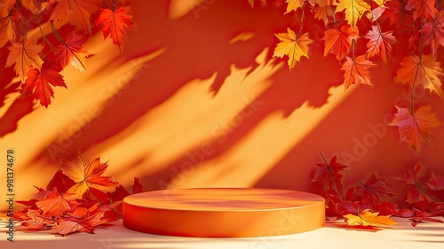 Podium with red autumn leaves on orange background with shadows. Showcase for product presentation, autumn background .generative ai