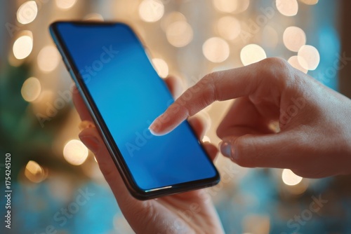 Point finger on screen phone closeup, person testing test message, touch blue screen on smartphone. Night Bokeh Light. Close-UP. Person using in hands mobile phone close up in the dark. Online wi-fi