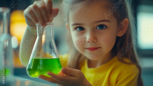 Point of view from a little girls hand holding a beaker with green liquid, in a science lab in the day time