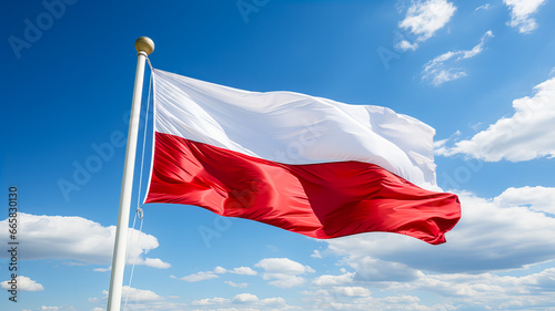 Poland flag waving in the wind against blue sky with white clouds. Generative AI technology.