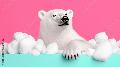 polar, bear, bathe, bubble, relaxation, cute, colourful, pink, turquoise, animal, fun, whimsical, portrait, nature, wildlife, foam, fluffy, character, vibrant, humorous, friendly, comfort, beauty, cloud, cosy, playful, furry, smooth, expression, setting, joy, cheerful, scenery, calmness, space, copy space, background, environment, creativity, leisure, lifestyle