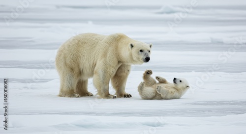 Polar Bear Mother and Cub on Ice - A heartwarming scene of a polar bear mother watching her playful cub roll in the snow