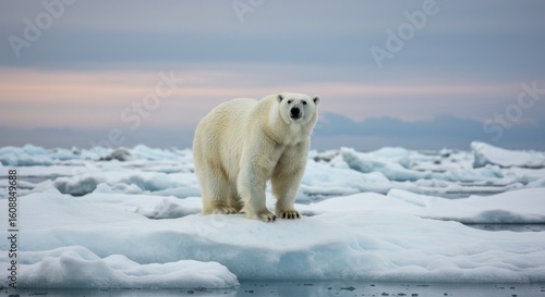 Polar bear stands on ice floe with cloudy sky and ice chunks