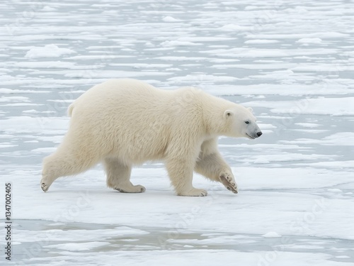 Polar Bear Strolling on Ice: A majestic polar bear strides across a vast expanse of icy terrain, showcasing its thick fur and powerful physique. Witness the resilience of the arctic.