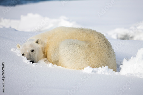norge, svalbard, outdoors, horizontal, white, solitude, polar bear, bear, endangered species, coastal, cold, ocean, iceberg, ice, snow, sleeping, cosy, curled, lying down, sleepy, sleepy, fatigue, quiet, nature, wilderness, wildlife, full-length, nobody, no people, one animal, 1, day, daytime, daylight, summer, sunny, sunshine, color image
