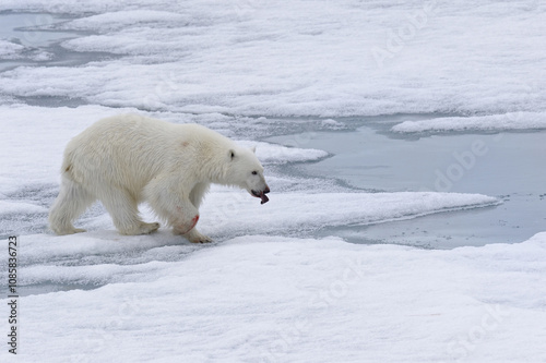 Polar bear (Ursus maritimus), female walking on pack ice, Svalbard Archipelago, Barents Sea, Arctic, Norway