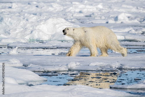 Polar bear (Ursus maritimus) walking over drift ice, Svalbard, Norway. July.