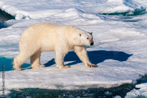 Polar bear walking between ice floats on a large ice pack in the Arctic Circle, Barentsoya, Svalbard, Norway