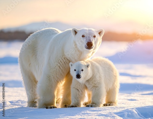 Polar bears mother and cub in arctic sunrise