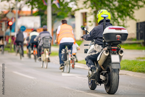 Police officer on motorcycle secures group of cyclists on city road, street, asphalt