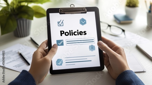 Policy documentation and compliance concept. A person reviews digital document labeled text "Policies" with icons, checklists, certifications, and financial detail. policy management, regulatory com