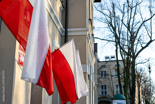 Polish flags against blue sky. Flags of Poland on the wind. Independence day celebration