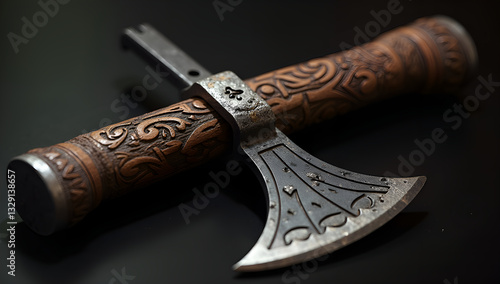 hatchet, wood, engraved, metal, rustic, tabletop, decoration, carving, craftsmanship, emblem, handle, tool, star, motif, edge, intricate, design, traditional, artistic, sharp, polished, timber, detail, ornate, pattern, homestead, vintage, blade, artisan, cultural, mediaeval, carpenter's shop, forged, decorative, collectable, handcraft