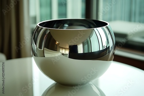 bowl, polished, city, view, table, interior, decor, modern, design, architecture, glasses, silver, round, object, home, decoration, stylish, contemporary, dining, tableware, shiny, glassware, luxury, tabletop, living room, room, decorative, elegant, mirror
