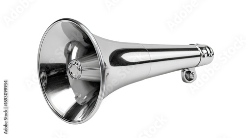 megaphone, chrome, polished, metal, horn, sound, amplified, loud, speaker, conical, tubular, instrument, communication, noise, signal, alert, emergency, vehicle, transportation, public, announcement, broadcast, directional, concave, convex, reflective, shiny, bright, equipment, object, isolated, studio, photo, digital, image, product, design, industrial, loudspeaker, audible, projection, focused, clear, audio, sharp, metallic