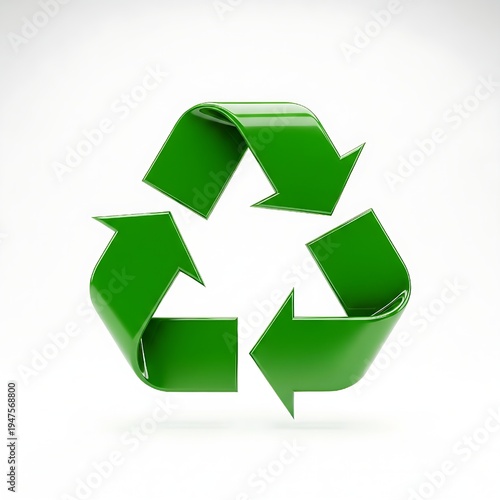 Polished green recycling icon featuring realistic reflections and three-dimensional arrows designed for eco-friendly marketing and waste management themes