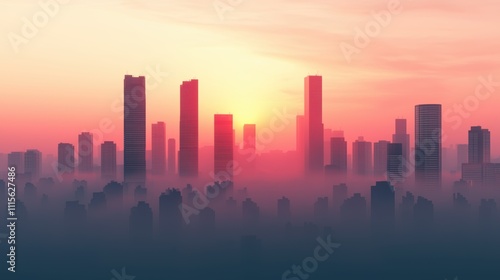 Pollution toxins air. Urban skyline at sunset with a hazy atmosphere.