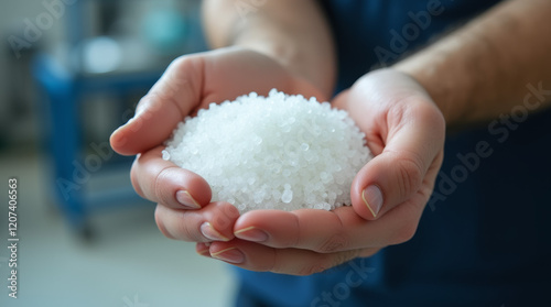 Polypropylene Granules close up. Factory Worker’s Hand Holding Raw Plastic Granules. Essential Material for Plastic Product Manufacturing