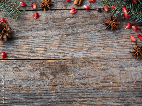Pomegranate spruce branches star anise nuts, cinnamon and winter spices on wooden background, Rustic style Copy space