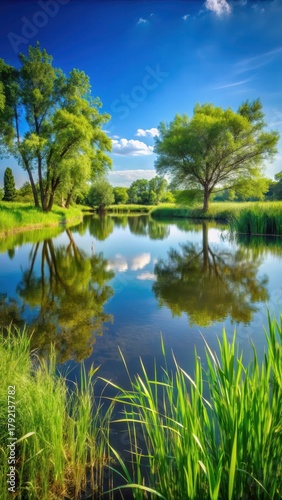 Pond with green trees and tall grass in foreground on clear sunny day