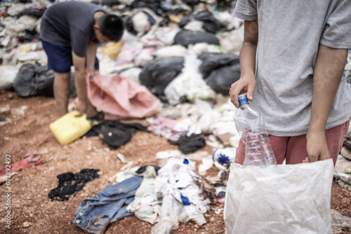 Poor children on the garbage dump and selecting plastic waste to sell, children not in school, poverty.