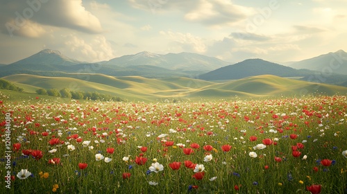 field, poppy, flower, mountain, meadow, grass, landscape, nature, summer, sky, green, hill, rural, scenery, wildflower, bloom, sun, horizon, flora, natural, beauty, plant, garden, bright, red, white, blue, cloud, sunshine, colours, fresh, vibrant, scenic, spring, foliage, farm, countryside