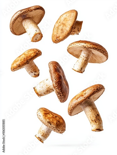 Porcini mushrooms suspended in mid-air isoalted against a pristine white background. Ideal for concepts related to organic food, culinary ingredients, and natural produce.