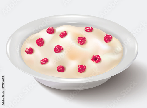 Porridge with fruits. A white plate of porridge with raspberries. Illustration isolated on white background with shadow.