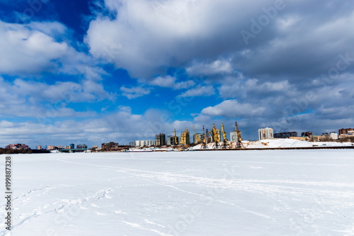 moscow, russia, winter, port, industrial, river, ice, snow, container, blue, skyline, water, landscape, boat, harbor, sky, white, travel, view, coast, ship, dock, day, building, crane, crane, shipping, container, cargo, transportation, dock, export, trade, business, logistic, import, industry, commerce, transport, freight, terminal, delivery, pier, international