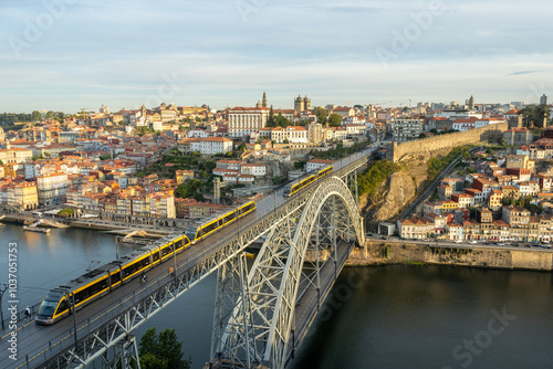 Porto City, Douro River and Dom Luis Bridge I with Trams in Morning. View from Tourist Viewpoint Miradouro da Serra do Pilar. Portugal