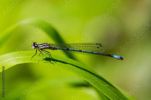 portrait azure damselfly (coenagrion puella) on green leaf